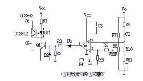 2、工作原理:當輸出U0升高,經(jīng)取樣電阻R7、R8、R10、VR1分壓后,U1③腳電壓升高,當其超過U1②腳基準電壓后U1①腳輸出高電平,使Q1導(dǎo)通,光耦OT1發(fā)光二極管發(fā)光,光電三極管導(dǎo)通,UC3842①腳電位相應(yīng)變低,從而改變U1⑥腳輸出占空比減小,U0降低。