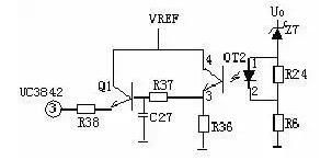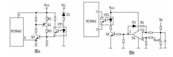 圖A的工作原理是,當(dāng)輸出電壓Uo升高,穩(wěn)壓管導(dǎo)通,光耦導(dǎo)通,Q2基極得電導(dǎo)通,由于Q2的導(dǎo)通Q1基極電壓降低也導(dǎo)通,Vcc電壓經(jīng)R1、Q1、R2使Q2始終導(dǎo)通,UC3842③腳始終是高電平而停止工作。在圖B中,UO升高U1③腳電壓升高,①腳輸出高電平,由于D1、R1的存在,U1①腳始終輸出高電平Q1始終導(dǎo)通,UC3842①腳始終是低電平而停止工作。正反饋?