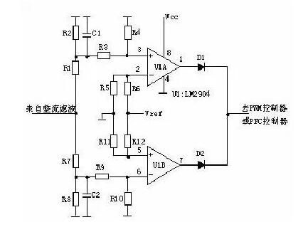 2、工作原理:AC輸入和DC輸入的開關(guān)電源的輸入過欠壓保護(hù)原理大致相同。保護(hù)電路的取樣電壓均來自輸入濾波后的電壓。取樣電壓分為兩路,一路經(jīng)R1、R2、R3、R4分壓后輸入比較器3腳,如取樣電壓高于2腳基準(zhǔn)電壓,比較器1腳輸出高電平去控制主控制器使其關(guān)斷,電源無輸出。另一路經(jīng)R7、R8、R9、R10分壓后輸入比較器6腳,如取樣電壓低于5腳基準(zhǔn)電壓,比較器7腳輸出高電平去控制主控制器使其關(guān)斷,電源無輸出。