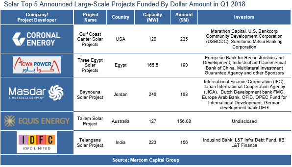 2018年第一季度17筆交易中宣布的債務(wù)融資總額為18億美元。環(huán)比來(lái)看,2017年第四季度共宣布了23筆交易,總額為44億美元。同比之下,2017年第一季度有25筆交易募集了22億美元。2018年第一季度大部分債務(wù)都是由太陽(yáng)能下游公司提供。