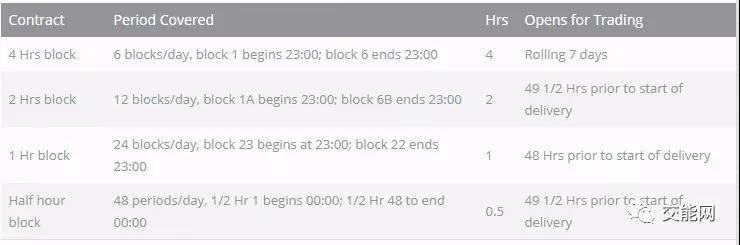 小時(shí)交易合約覆蓋日前合約以外的4小時(shí),交易時(shí)間為10:15 PM,在相應(yīng)的流動(dòng)期前三天。日前合同可以作為基本負(fù)荷(每小時(shí)1MW的恒流電力,11:00 PM到第二天晚上11:00 PM,每日)和峰值負(fù)荷(恒流每小時(shí)1MW的電力,7:00 AM到7:00 PM,周一至周五)。這些合約在上市前兩天的10:15 PM上市交易。所有合同的報(bào)價(jià)單位是£/kWh,最小單位為£0.01?,F(xiàn)貨合約是連續(xù)交易的。