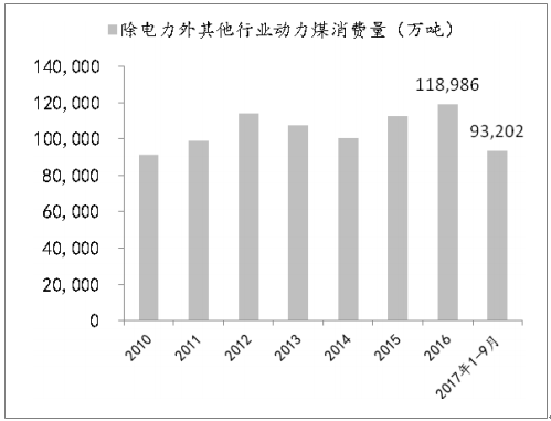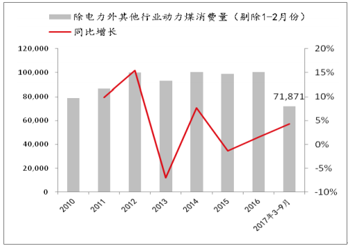 除電力行業(yè)動(dòng)力煤消費(fèi)占比約60%以外,建材、化工、冶金、供熱及其他行業(yè)動(dòng)力煤消費(fèi)量合計(jì)占比約40%。2016年,除電力外其他行業(yè)動(dòng)力煤消費(fèi)合計(jì)11.9億噸,同比增長(zhǎng)5.84%;2017年1-9月,除電力外其他行業(yè)動(dòng)力煤消費(fèi)合計(jì)7.2億噸,同比增長(zhǎng)6.38%。