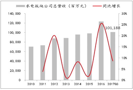 2017年1-9月,我國(guó)水電發(fā)電量8147億千瓦時(shí),同比增長(zhǎng)0.3%。水電板塊19家企業(yè)合計(jì)實(shí)現(xiàn)營(yíng)收約1012億元,同比增加8.63%;合計(jì)實(shí)現(xiàn)歸母凈利潤(rùn)298億元,同比增長(zhǎng)2.52%。