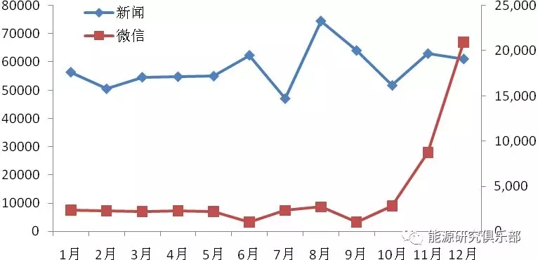 10~12月,黨的十九大召開,能源電力政策出臺較為密集,電力國企改革集中發(fā)布,新媒體平臺影響力愈加增強。憑借移動終端傳播優(yōu)勢,微信關(guān)注陡然上升。11月8日~10日,美國總統(tǒng)特朗普訪華期間,中美簽署項目34個,金額最大的集中在能源領(lǐng)域,或超千億美元。12月19日,國家發(fā)展改革委發(fā)布《全國碳排放權(quán)交易市場建設(shè)方案(發(fā)電行業(yè))》,全國碳排放交易體系正式啟動。12月26日,2018年全國能源工作會議在北京召開。