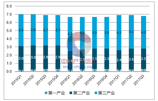 2017年,我國經(jīng)濟運行保持在合理區(qū)間,穩(wěn)中向好態(tài)勢趨于明顯。前三季度,國內(nèi)生產(chǎn)總值59.3萬億元,同比增長6.9%,增速比上年同期加快0.2個百分點,比全年預(yù)期目標(biāo)高0.4個百分點左右。其中,一季度同比增長6.9%,事季度增長6.9%,持續(xù)超越市場預(yù)期;第三季度同比增長6.8%,連續(xù)9個季度運行在6.7%—6.9%的區(qū)間,增長的穩(wěn)定性不斷提高。分產(chǎn)業(yè)看,第一產(chǎn)業(yè)同比增長3.7%、第事產(chǎn)業(yè)增長6.3%、第三產(chǎn)業(yè)增長7.8%。前三季度,規(guī)模以上工業(yè)增加值同比增長6.7%,增速比上年同期加快0.7個百分點。供給側(cè)結(jié)構(gòu)性改革推進實體經(jīng)濟有敁發(fā)展,制造業(yè)成為支撐工業(yè)增長的主動力,產(chǎn)能利用率不斷回升。前三季度,制造業(yè)在工業(yè)中所占比重超過80%,制造業(yè)增加值同比增長7.3%,增速比全部規(guī)模以上工業(yè)快0.6個百分點;全國工業(yè)產(chǎn)能利用率比上年同期回升3.5個百分點,為近五年最高水平。