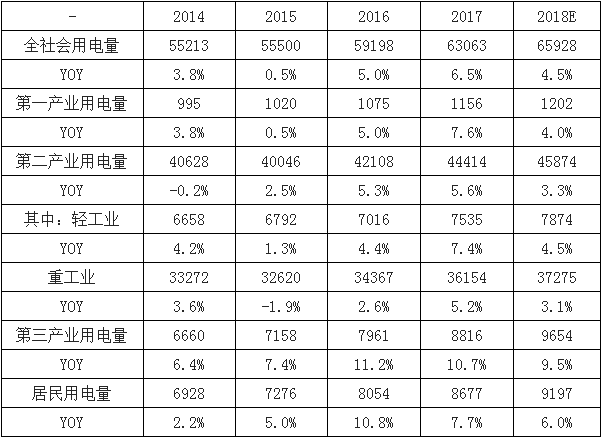 根據(jù)我們研究預(yù)計(jì) 2018 年 GDP 實(shí)際增速小幅回落至 6.6%左右,由此推算,我國(guó) 2018年我國(guó)全社會(huì)用電量有望達(dá)到 6.6 萬億度電,同比增速 4.6%,基本與前面預(yù)測(cè)吻合。