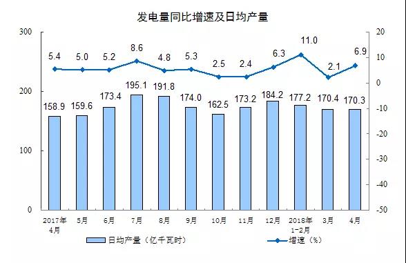 分品種看,火電增速加快,水電降幅收窄。4月份,火電增長7.3%,增速比上月加快5.9個百分點;水電下降2.6%,降幅收窄2.7個百分點;核電增長6.5%,加快4.8個百分點;風電、太陽能發(fā)電保持兩位數(shù)高增長,分別增長22.6%、26.4%。