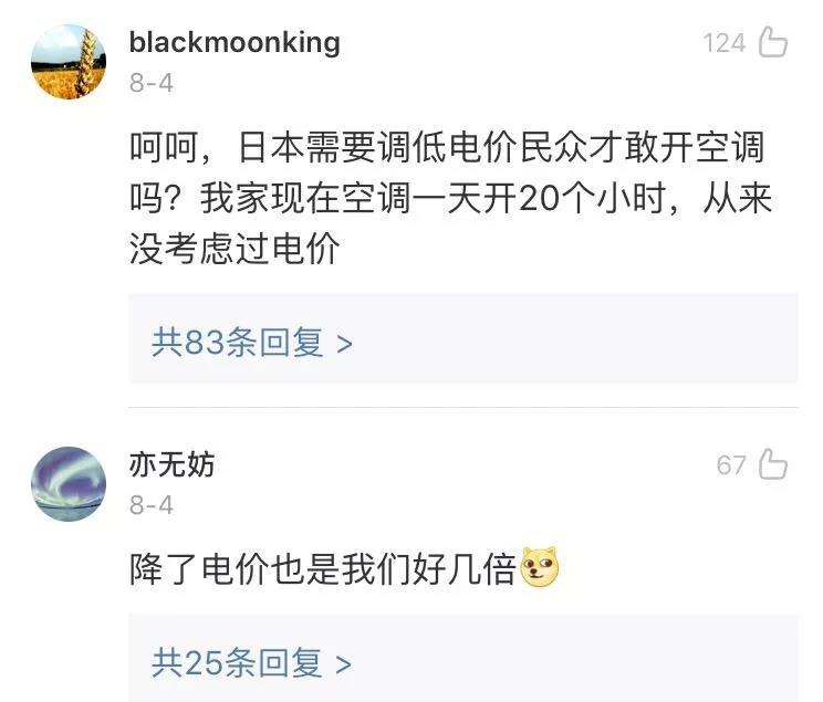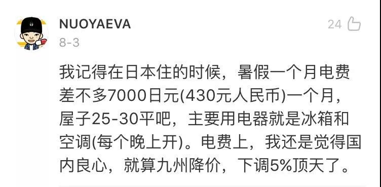 另外,頭條君還聯(lián)系了一位在東京居住已經(jīng)超過10年的朋友。他家使用的電力來自東京電力公司,他家在夏天用空調(diào)的情況下,一個月電費大約1.5萬日元(約926元人民幣)。他說,從2011年大地震后,就比較缺電,今年夏天也沒有收到過關(guān)于降電費的信息。