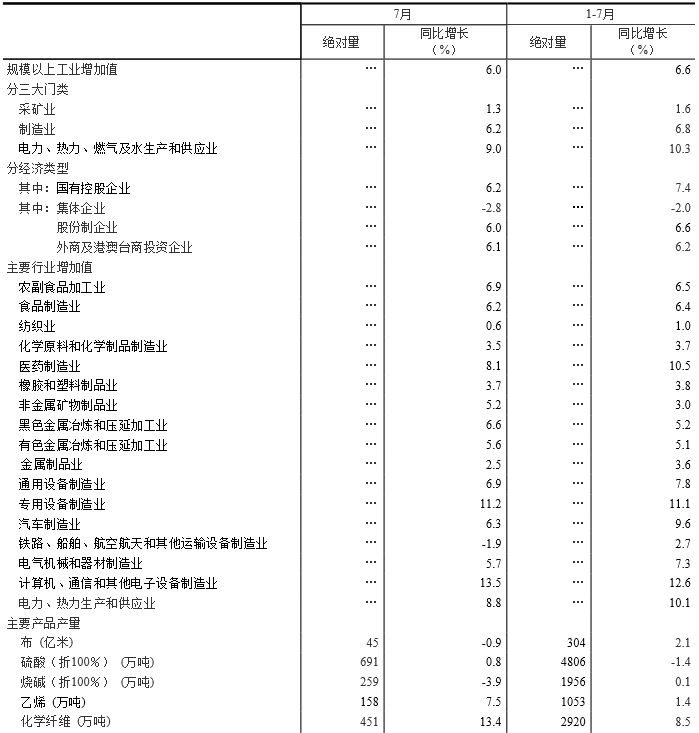 分三大門類看,7月份,采礦業(yè)增加值同比增長1.3%,增速較6月份回落1.4個(gè)百分點(diǎn);制造業(yè)增長6.2%,加快0.2個(gè)百分點(diǎn);電力、熱力、燃?xì)饧八a(chǎn)和供應(yīng)業(yè)增長9.0%,回落 0.2個(gè)百分點(diǎn)。