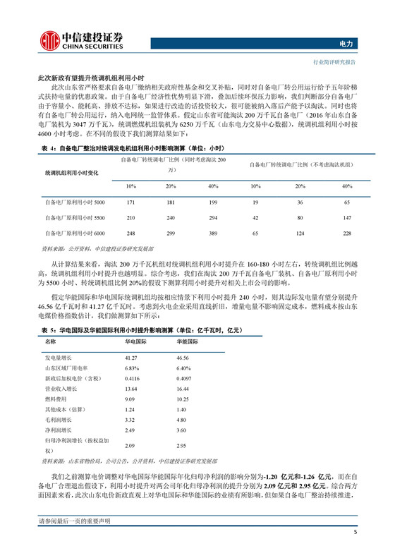 綜合而言,華電國(guó)際約有 852 萬(wàn)千瓦裝機(jī)降價(jià) 1.1 分, 259.5 萬(wàn)千瓦裝機(jī)降幅在 0.1 分至 0.5 分之間;華能國(guó)際約有 754 萬(wàn)千瓦裝機(jī)降價(jià) 1.1 分, 444 萬(wàn)千瓦裝機(jī)降幅在 0.004 分至 1 分之間。進(jìn)一步考慮降價(jià)對(duì)于兩公司營(yíng)收及業(yè)績(jī)的影響,我們假定利用小時(shí)為 4500 小時(shí),同時(shí)考慮山東統(tǒng)調(diào)機(jī)組計(jì)劃電量占發(fā)電量 53%( 18 年上半年數(shù)據(jù),假定 47%的市場(chǎng)電不受電價(jià)調(diào)整影響),結(jié)合上市公司對(duì)相關(guān)電廠的權(quán)益占比,測(cè)算結(jié)果如表 3 所示。 根據(jù)測(cè)算結(jié)果顯示,在相關(guān)假設(shè)下,華電國(guó)際和華能國(guó)際年化歸母凈利潤(rùn)影響分別為-1.20 億和-1.26 億??紤]到此次降價(jià)政策自今年 9 月 1 日起執(zhí)行, 華電國(guó)際和華能國(guó)際 18 年歸母凈利受損分別為-4000 萬(wàn)元和-4200萬(wàn)元。