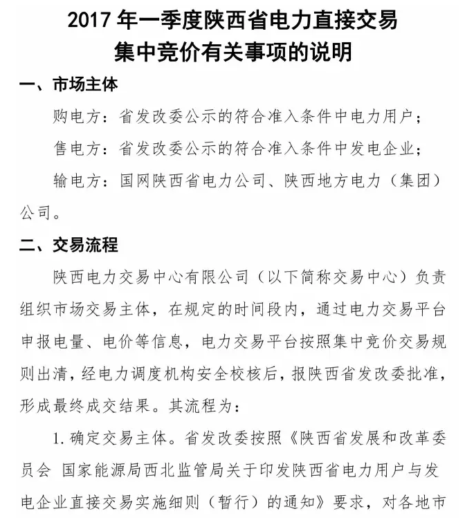 各電力用戶和發(fā)電企業(yè):為積極探索我省電力體制改革,推進電力市場化建設,發(fā)揮陜西電力交易中心交易平臺的作用,按照《陜西省發(fā)展和改革委員會 國家能源局西北監(jiān)管局關于印發(fā)陜西省電力用戶與發(fā)電企業(yè)直接交易