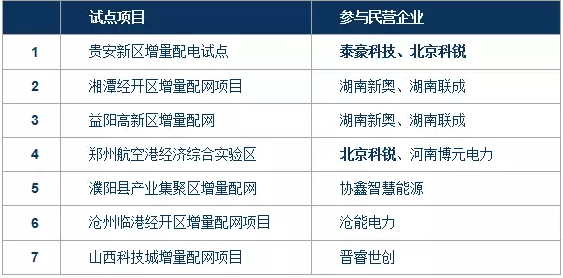 在國家電網(wǎng)經(jīng)營區(qū)域內(nèi),也產(chǎn)生了首家非國網(wǎng)控股的增量配電網(wǎng)業(yè)務(wù)試點(diǎn)項(xiàng)目產(chǎn)生,該項(xiàng)目是山西科技城綜合能源供應(yīng)試點(diǎn)項(xiàng)目,由國家電網(wǎng)、管委會政府和社會資本共同成立,其中國家電網(wǎng)占股49%;民營企業(yè)協(xié)鑫參與的三個增量配網(wǎng)項(xiàng)目(安徽金寨、河南濮陽、江蘇揚(yáng)中)均與國家電網(wǎng)所屬公司合作。