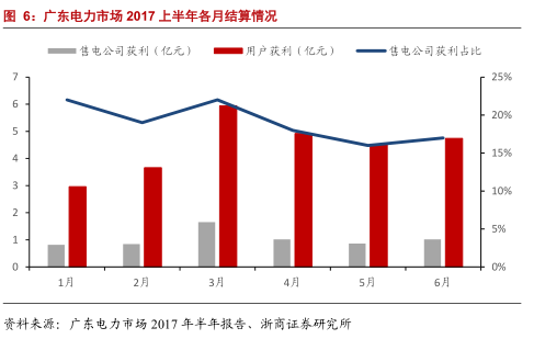售電公司獲取兩成讓利,競爭有望日趨激烈。據(jù)2017年廣東電力市場交易半年報披露,截至2017年6月底,廣東電力市場準入主體3896家,同比增長207%,其中電力用戶3514家,同比增長225%,售電公司332家,同比增長118%。目前在獲得準入的3896家市場主體中,已在廣東電力市場交易系統(tǒng)注冊登記3620戶,占92.91%。上半年,電廠讓利35.92億元,售電公司獲利6.21億元。用戶已獲利26.8億元,售電公司與用戶分成比例約2:8。各月結(jié)算情況如圖6所示。