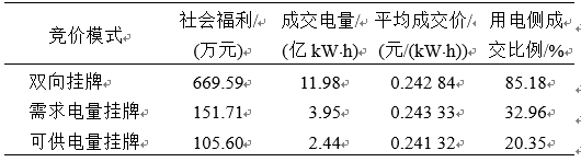 為了更好說(shuō)明雙向掛牌交易機(jī)制的優(yōu)勢(shì),在雙向掛牌交易申報(bào)數(shù)據(jù)的基礎(chǔ)上,在電廠掛牌用戶摘牌階段將用戶公示電量作為其摘牌電量上限,對(duì)用戶掛牌電廠摘牌階段將電廠公示電量作為其摘牌電量上限,分別計(jì)算得到可供電量掛牌和需求電量掛牌的單向競(jìng)價(jià)模式成交結(jié)果,同時(shí),根據(jù)式(8)和式(17),分別計(jì)算單向掛牌交易和發(fā)用電側(cè)雙向掛牌交易競(jìng)價(jià)模式的社會(huì)福利,如表1所示。