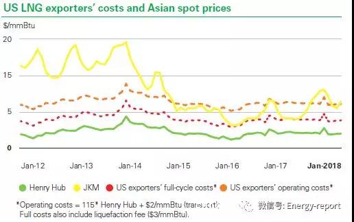 用日韓指標代表亞洲LNG現(xiàn)貨價格,該指標在過去的幾年中在美國出口全周期成本和它們的短期運營成本之間震蕩。美國LNG的出口商更愿意按照能覆蓋其運營成本的時間供應LNG,即使短期運營成本低于他們的全周期成本。