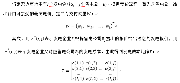 首先,在分析售電公司報價策略之前,需要對競價機制有所規(guī)定,在合同交易市場中的多對多雙邊交易模式下,不同于集中交易的地方主要在于這里的多對多是建立在一對一成交的基礎上,即一家發(fā)電企業(yè)只能與一家售電公司進行匹配,而集中交易下的多對多是可以一家發(fā)電企業(yè)與多家售電公司進行匹配的。