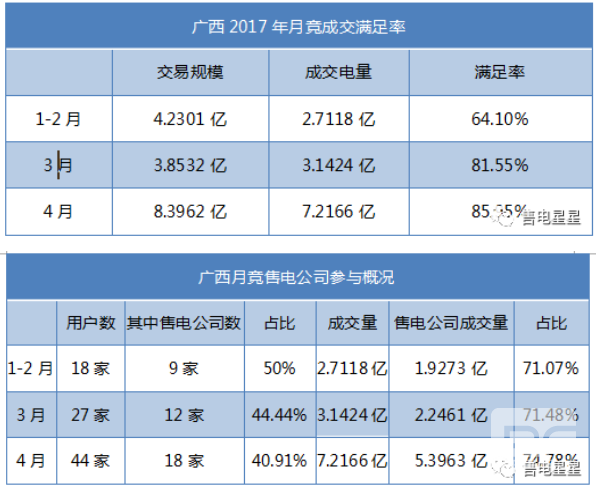 但由于3月13日廣西壯族自治區(qū)工業(yè)和信息化委員會文件《關(guān)于進(jìn)一步放寬電力用戶參與2017年電力市場化交易準(zhǔn)入條件的通知》提出:廣西電力市場全面放開35kV及以上電壓等級工業(yè)用戶準(zhǔn)入,不受用電量限制。在通知發(fā)布之后3月22號開展了4月份的月度競價(jià),成交7.2億電量(2月2.7億,3月3.1億),滿足率從最初的64%增長到84%,可發(fā)現(xiàn)隨著更多市場主體的參與,市場成交規(guī)模逐漸擴(kuò)大滿足率逐漸上升,未來市場可觀。