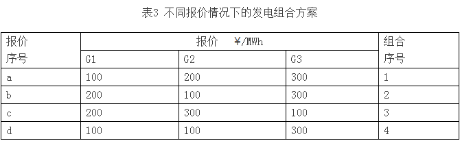 從上面的例子看,報(bào)價(jià)區(qū)的功率變化對(duì)關(guān)鍵支路的轉(zhuǎn)移分布因子,以及區(qū)域之間交易功率的極限,是與區(qū)內(nèi)發(fā)電的組合有關(guān)的。而在電力市場(chǎng)中,這個(gè)組合與發(fā)電的具體報(bào)價(jià)有關(guān)。表3給出了四種報(bào)價(jià)情況a、b、c及d。假設(shè)報(bào)價(jià)對(duì)應(yīng)的容量均為100MW。對(duì)發(fā)電機(jī)組的調(diào)用如果按照?qǐng)?bào)價(jià)從低到高的順序,則可以得到對(duì)應(yīng)報(bào)價(jià)情況下的組合序號(hào)。比如,報(bào)價(jià)情況a下,G1的報(bào)價(jià)最低,因此當(dāng)區(qū)域1增加送出功率時(shí),應(yīng)該全部由G1增加出力,對(duì)應(yīng)組合方案1;報(bào)價(jià)情況d下,G1和G2的報(bào)價(jià)相同,因此當(dāng)區(qū)域1增加送出功率時(shí),由G1和G2按容量比例共同承擔(dān),即按照1:1比例分配出力,因此對(duì)應(yīng)組合4。