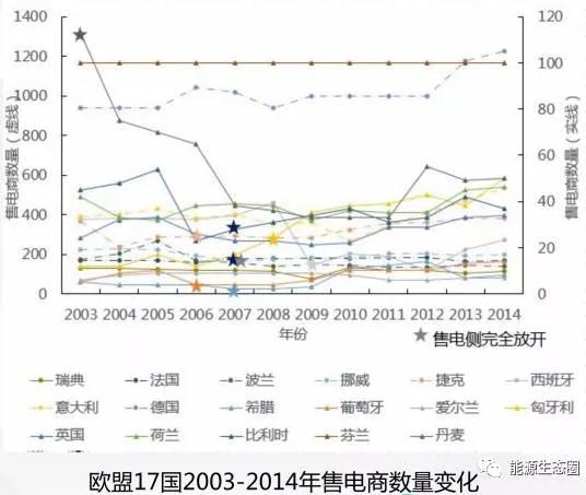 上圖顯示的是歐盟13個國家,2003-2014年售電商數(shù)量的變化。從上圖可以看出,大部分國家售電商的數(shù)量還是比較平穩(wěn)的。五角星的地方表示售電側(cè)從工業(yè)側(cè)開放到居民側(cè)的時間節(jié)點,可以看到五角星出現(xiàn)的前后數(shù)據(jù)沒有發(fā)生很大的波動,也就是說,售電公司的數(shù)量不會因為工業(yè)側(cè)或者居民側(cè)的開放而發(fā)生較大的變化,這也就意味著要進(jìn)入售電市場就要從一開始進(jìn)入,跟隨市場一起成長。