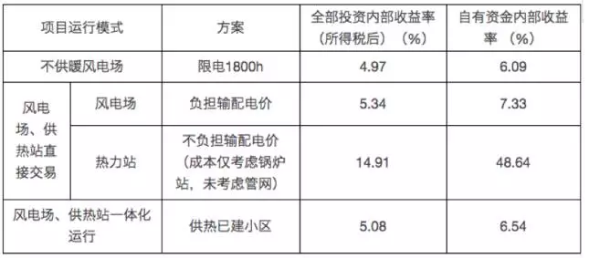 風(fēng)電清潔供暖既可以選擇與供熱站進(jìn)行直接交易,也可以采取一體化運(yùn)行的方式。文章《風(fēng)電供暖項(xiàng)目運(yùn)行模式及經(jīng)濟(jì)性初探》根據(jù)張家口地區(qū)的供暖方案進(jìn)行了經(jīng)濟(jì)性測(cè)算,結(jié)果如下: