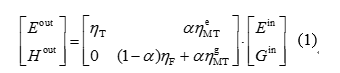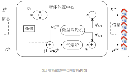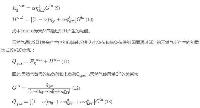式中:Ein、Gin分別為進(jìn)電量和進(jìn)氣量;ηT為變壓器變比;α為天然氣分配到微型渦輪機(jī)的比例;ηe M、ηg MT分別為天然氣通過(guò)微型渦輪機(jī)轉(zhuǎn)化為電能和熱能的效率;ηF為氣熔爐的產(chǎn)熱效率;Eout、Hout分別為送出的電量和熱量。