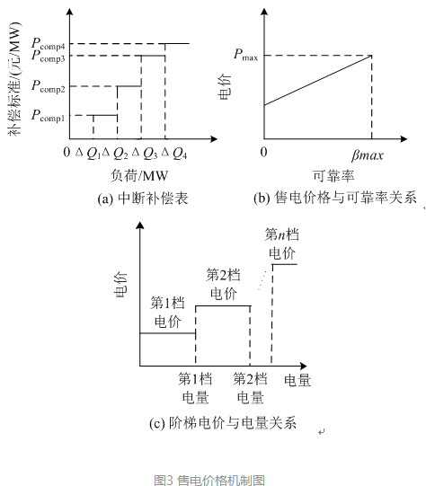 考慮到售電公司將面臨多種類(lèi)型的用戶(hù)而實(shí)行多種類(lèi)型的售電電價(jià)機(jī)制,包括可中斷電價(jià)、高可靠性電價(jià)和遞增式階梯電價(jià)。