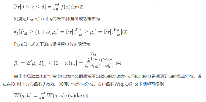 設(shè)t時(shí)段的市場(chǎng)清算價(jià)格為μt,售電公司的投標(biāo)電價(jià)為Pbt,當(dāng)Pbt>μt時(shí),售電公司競(jìng)價(jià)成功。而在Pbt=μt時(shí)可能出現(xiàn)競(jìng)價(jià)成功,但其所需的電量不能完全得到滿(mǎn)足的情況。售電公司對(duì)MCP的評(píng)價(jià)與市場(chǎng)MCP的實(shí)際值存在著不一致,因此引入變量ω,ω≥0。售電公司對(duì)MCP的評(píng)價(jià)為(1+ω)μt,市場(chǎng)MCP實(shí)際值為μt,當(dāng)ω=0時(shí)表示評(píng)價(jià)與實(shí)際值一致,只要報(bào)價(jià)Pbt≥(1+ω)μt,就可保證競(jìng)價(jià)成功。