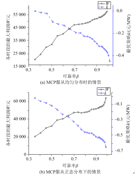 對(duì)比兩圖可看出,不同MCP分布情景下,可靠率的改變不會(huì)改變最優(yōu)策略變化趨勢(shì),而改變了最優(yōu)位置。