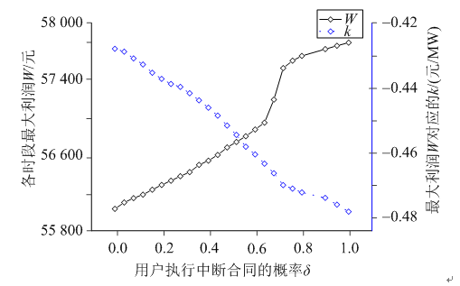 圖11研究了中斷負(fù)荷用戶(hù)執(zhí)行中斷合同的概率δ與最優(yōu)競(jìng)價(jià)購(gòu)電策略間的關(guān)系。中斷概率的增大增加了競(jìng)價(jià)成功的概率,因而售電公司參與市場(chǎng)競(jìng)價(jià)的電量增多,且報(bào)價(jià)幾乎不變,依據(jù)式(18),k逐漸變小;競(jìng)價(jià)成功的概率增大,售電公司獲得的利潤(rùn)大于其損失的中斷負(fù)荷造成的損失,利潤(rùn)增多。同時(shí)從圖11中可見(jiàn),當(dāng)δ=0時(shí)售電公司獲得的利潤(rùn)為56 032.77元,δ=1時(shí)利潤(rùn)為57 791.02元,其利潤(rùn)相差并不大,主要是由于售電公司主動(dòng)的使用天然氣對(duì)用戶(hù)不執(zhí)行中斷合同時(shí)的調(diào)節(jié),使得其能避免更大的損失。