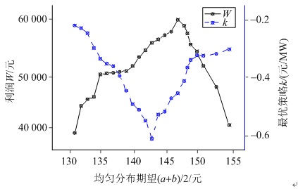 MCP服從均勻分布的情景。兩圖中k都先減小后增大,利潤(rùn)先增加后減少。原因是:增加的負(fù)荷量多于天然氣和中斷負(fù)荷的調(diào)節(jié)量,而報(bào)價(jià)不變,則k逐漸減小,當(dāng)中斷量和天然氣調(diào)節(jié)能力大于階梯電量需求的增量時(shí)k值相較于前時(shí)段變大;由于可中斷負(fù)荷和天然氣之間的協(xié)調(diào)調(diào)節(jié),隨著電量需求的增加,而競(jìng)價(jià)成功的概率不變,售電公司獲得了更多的市場(chǎng),從而獲得更多的收益。隨著階梯電量的進(jìn)一步增加,提供協(xié)調(diào)的補(bǔ)償負(fù)荷已不能繼續(xù)平衡需求,總利潤(rùn)將減少,此時(shí)應(yīng)將利潤(rùn)減少到超出規(guī)定利潤(rùn)范圍部分時(shí)的階梯電量歸為下一檔。