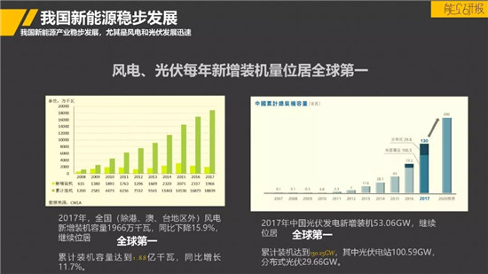 截至2017年底,全國(guó)風(fēng)電累計(jì)裝機(jī)1 88億千瓦,光伏發(fā)電累計(jì)裝機(jī)達(dá)1 3億千瓦,穩(wěn)居全球第一。市場(chǎng)規(guī)??焖贁U(kuò)大,得益于新能源發(fā)電成本的下降