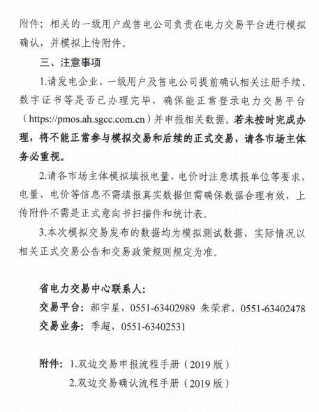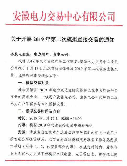 安徽電力交易中心日前發(fā)布了《關(guān)于開(kāi)展2019年第二次模擬直接交易的通知》,安徽電力交易中心有限公司擬組織市場(chǎng)主體開(kāi)展2019年第二次模擬直接交易