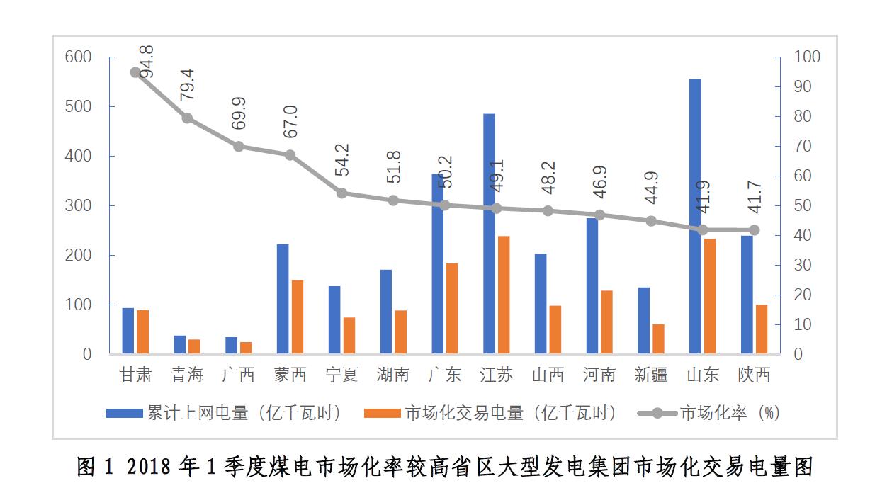 2018年1季度,大型發(fā)電集團(tuán)煤電機(jī)組上網(wǎng)電量5995億千瓦時(shí),占其總上網(wǎng)電量的71 %;市場化交易電量1872億千瓦時(shí),市場化率為31.2%,其中跨區(qū)、跨省外送市場化交易電量222億千瓦時(shí)。煤電上網(wǎng)電量平均電價(jià)(計(jì)劃與市場電量加權(quán)平均電價(jià),以下同)為0.365元/千瓦時(shí),市場化交易(含跨區(qū)跨省市場化交易)平均電價(jià)為0.331元/千瓦時(shí)。
