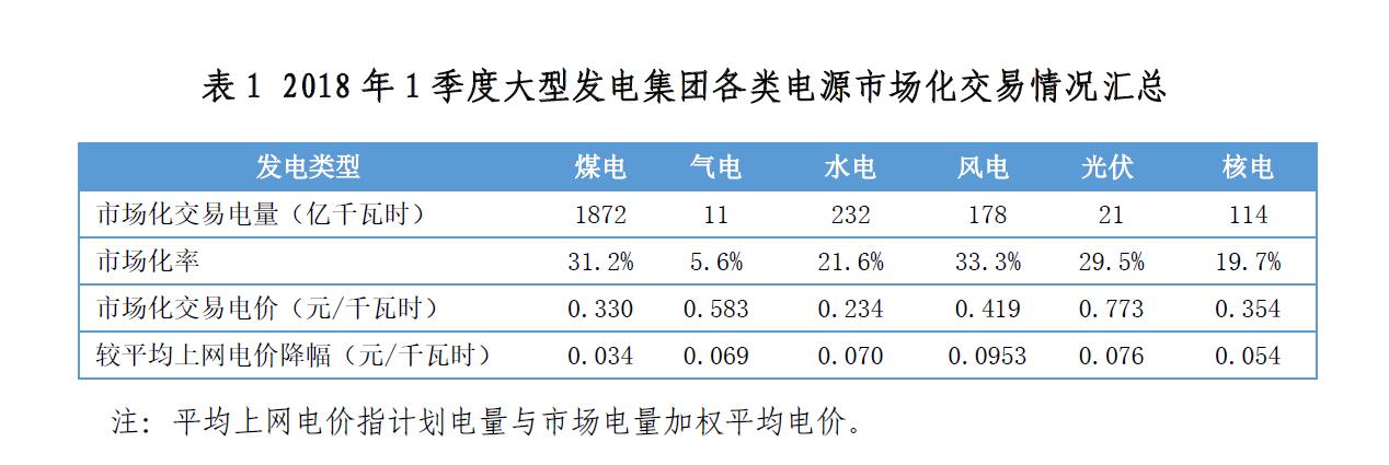 2018年1季度,大型發(fā)電集團(tuán)上網(wǎng)電量合計(jì)8445億千瓦時(shí),市場(chǎng)化交易電量合計(jì)2427億千瓦時(shí)(不含發(fā)電權(quán)交易)。