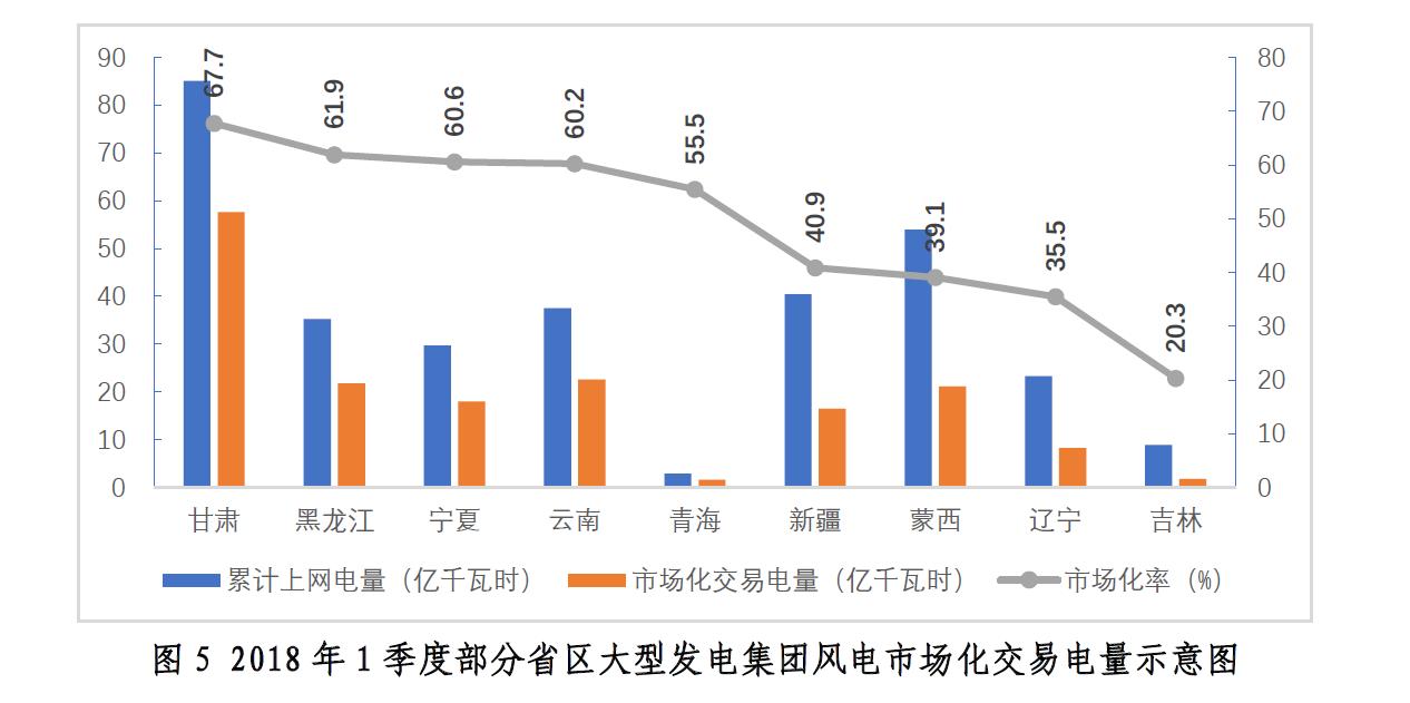 2018年1季度,大型發(fā)電集團(tuán)風(fēng)電機(jī)組累計(jì)上網(wǎng)電量534億千瓦時(shí),占其總上網(wǎng)電量的6.3%;風(fēng)電市場(chǎng)化交易電量177億千瓦時(shí),市場(chǎng)化率為33.3%,其中跨區(qū)跨省交易電量約113億千瓦時(shí),占市場(chǎng)化交易電量比重63.8%。