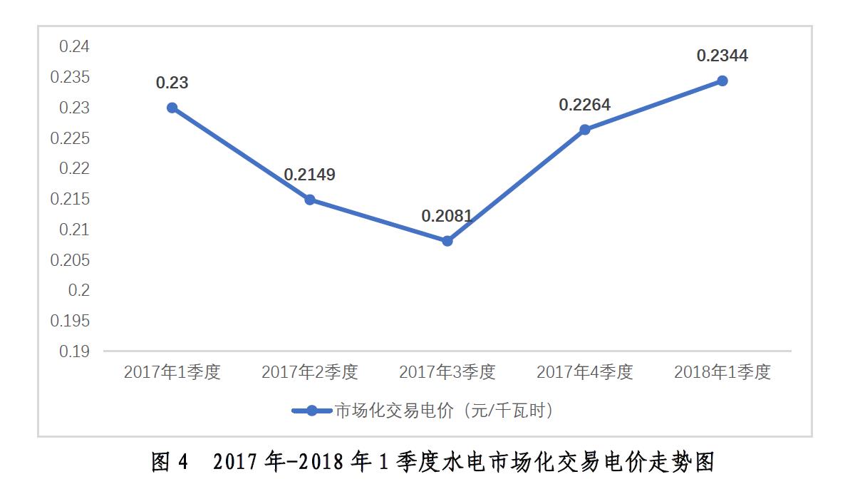 2018年1季度,大型發(fā)電集團(tuán)水電機(jī)組上網(wǎng)電量1075億千瓦時(shí),占其總上網(wǎng)電量的12.7%;水電市場(chǎng)化交易電量232億千瓦時(shí),市場(chǎng)化率達(dá)到21.6%,市場(chǎng)交易平均電價(jià)為0.234元/千瓦時(shí)。