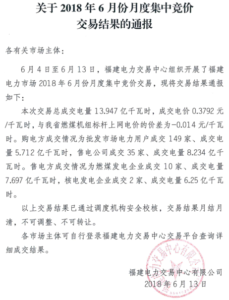 福建發(fā)布2018年6月份月度集中競(jìng)價(jià)交易結(jié)果:成交電量13.947億千瓦時(shí)