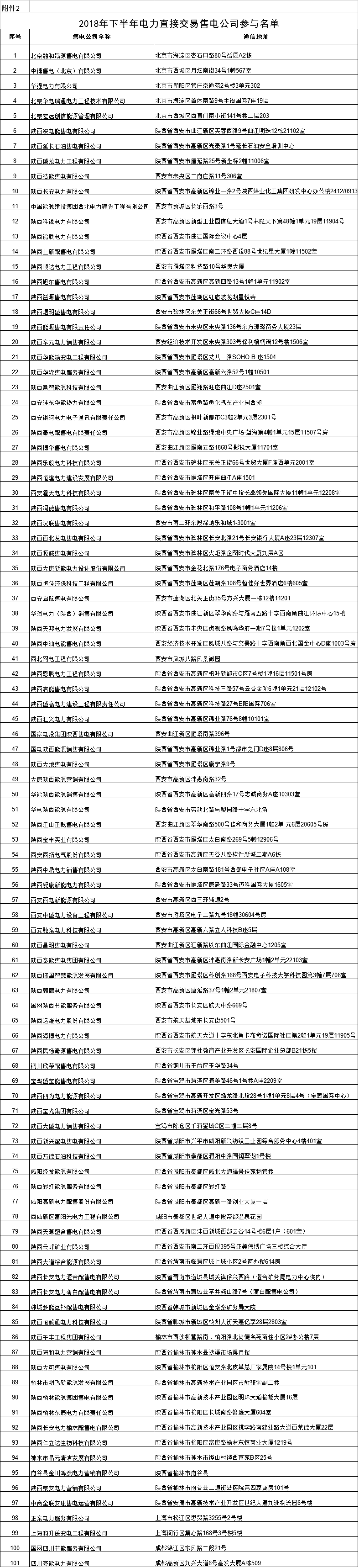 在陜西電力交易中心有限公司注冊(cè),并經(jīng)公示無(wú)異議的101家售電公司(附件2)。