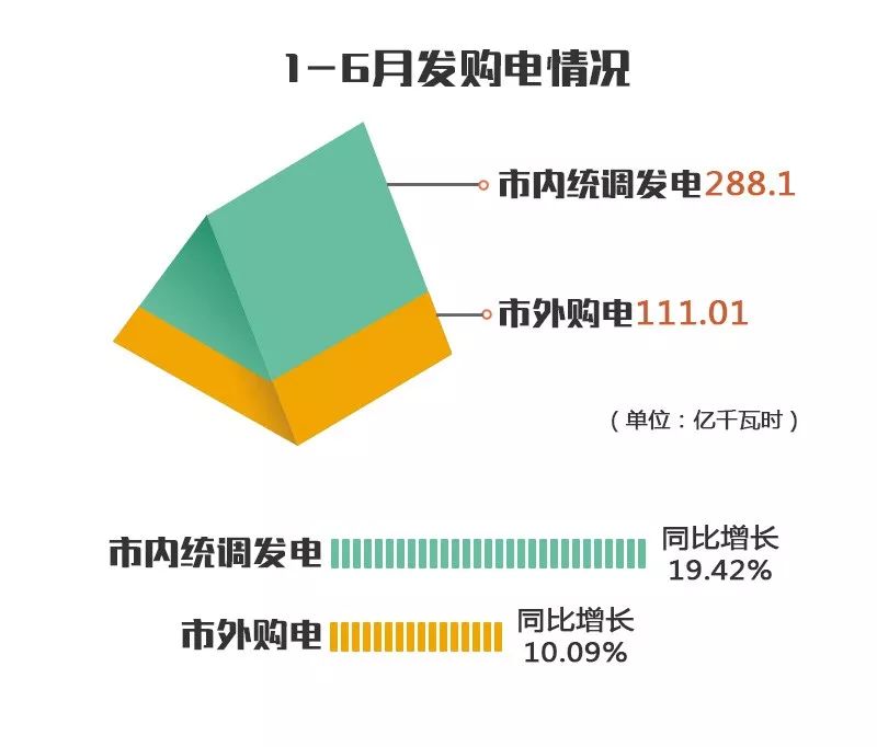 1~6月,市內(nèi)統(tǒng)調(diào)發(fā)電288.1億千瓦時,同比增長19.42%。其中,火電188.59億千瓦時,同比增長23.70%;水電82.19億千瓦時,同比增長14.06%;新能源4.19億千瓦時,同比增長25.64%。市外購電111.01億千瓦時,同比增長10.09%。統(tǒng)調(diào)電廠發(fā)電利用小時數(shù)1441小時,其中,火電1363小時,水電1707小時。