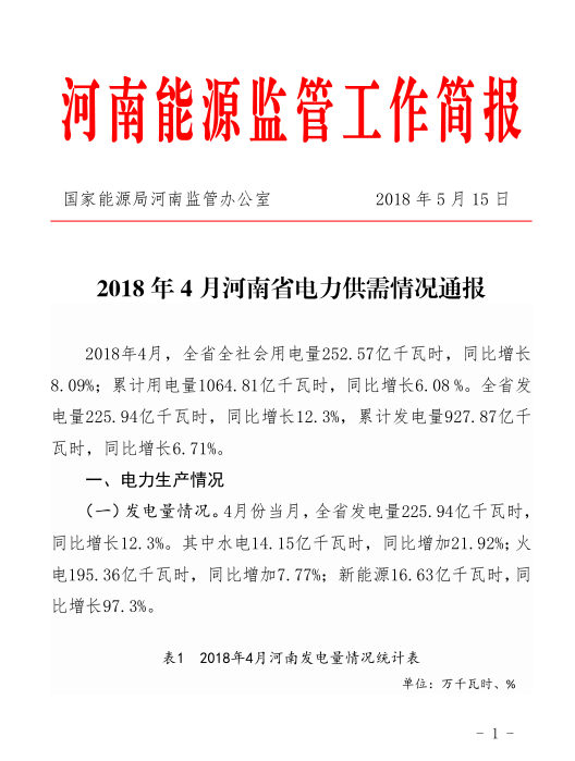 河南能監(jiān)辦日前發(fā)布了《2018年4月河南省電力供需情況通報》,2018年4月,河南省全社會用電量252.57億千瓦時,同比增長8.09%;累計用電量1064.81億千瓦時,同比增長6.08%。
