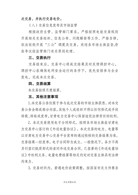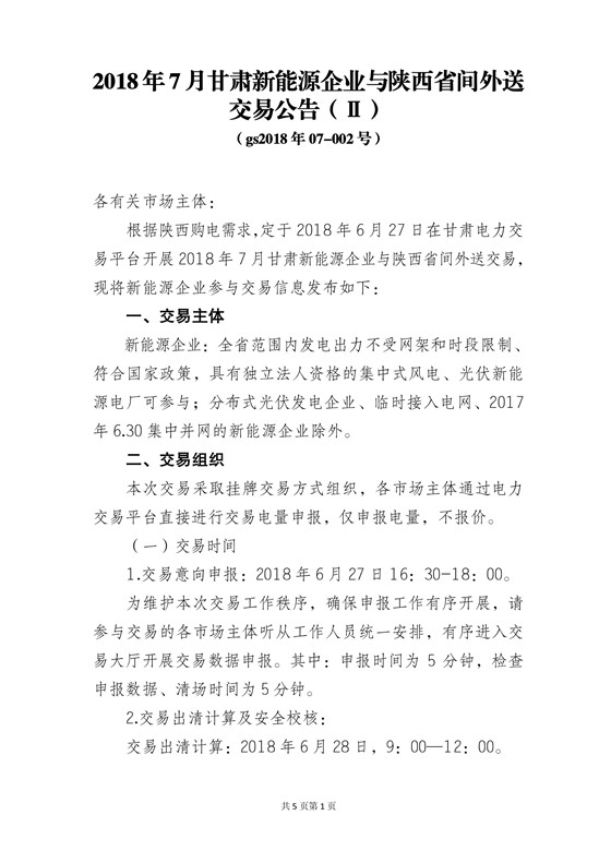 甘肅電力交易中心日前發(fā)布了《2018年7月甘肅外送陜西交易公告》,甘肅火電企業(yè)、新能源企業(yè)與陜西省間外送交易采用掛牌交易方式,本次火電
