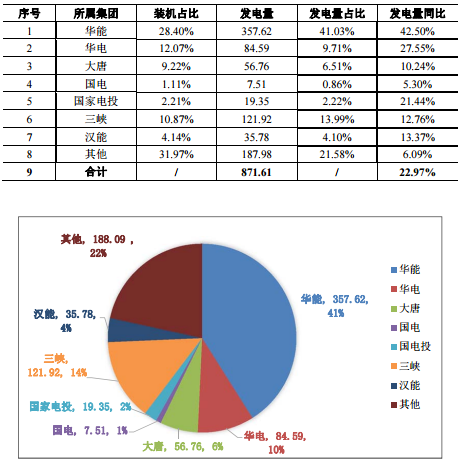 按所屬集團(tuán)來看,2017 年上半年,云南統(tǒng)調(diào)水電發(fā)電量中,華能發(fā)電量 357.62 億千瓦時,同比增加 42.5%,占比 41.03%;華電發(fā)電量 84.59 億千瓦時,同比增加 27.55%,占比 9.71%;大唐發(fā)電量56.76 億千瓦時,同比增加 10.24%,占比 6.51%;國電發(fā)電量 7.51 億千瓦時,同比增加 5.3%,占比 0.86%;國家電投發(fā)電量 19.35 億千瓦時,同比增加 21.44%,占比 2.22%;三峽發(fā)電量 121.92 億千瓦時,同比增加 12.76%,占比 13.99%;漢能發(fā)電量 35.78 億千瓦時,同比增加 13.37%,占比 4.1%;其他集團(tuán)合計發(fā)電量 187.98 億千瓦時,同比增加 6.09%,占比 21.58%。