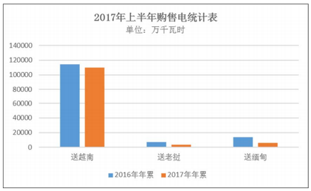 2017 年上半年,云南電網(wǎng)累計送境外電量 11.90 億千瓦時,同比減少 12.01%。其中,送越南 10.98 億千瓦時,同比減少 4.19%;送老撾 0.33 億千瓦時,同比減少 50.61%;送緬甸 0.58 億千瓦時,同比減少 58.08%。