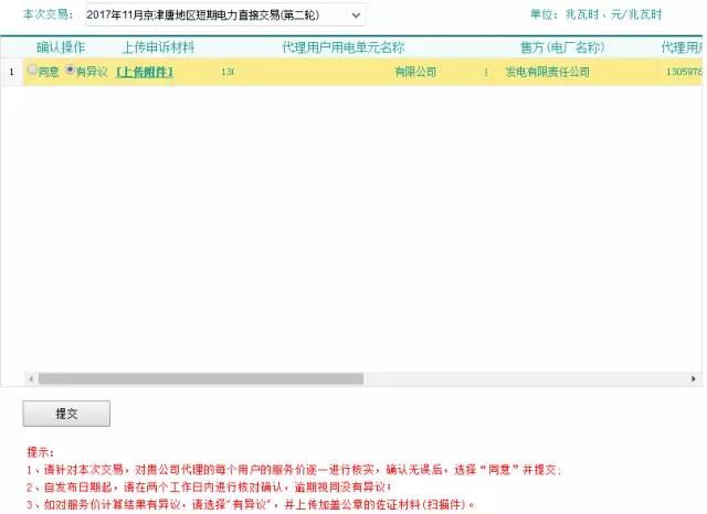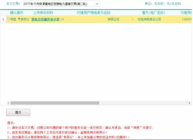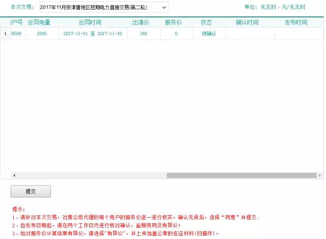 5.請(qǐng)逐條核對(duì)所代理用戶的購(gòu)售電服務(wù)價(jià)格。若服務(wù)價(jià)格核對(duì)無誤,請(qǐng)選擇“同意”,并點(diǎn)擊【提交】。