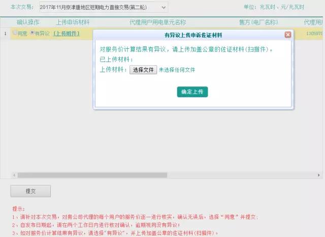 7.在對(duì)話框中點(diǎn)擊【選擇文件】,上傳蓋章版“購(gòu)售電服務(wù)價(jià)格確認(rèn)單”(附件2),并點(diǎn)擊【確定上傳】。