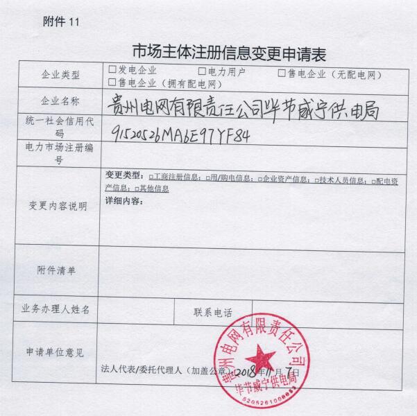 附件2:《市場主體注冊信息變更申請表(貴州電網(wǎng)有限責(zé)任公司畢節(jié)威寧供電局)》(另附)