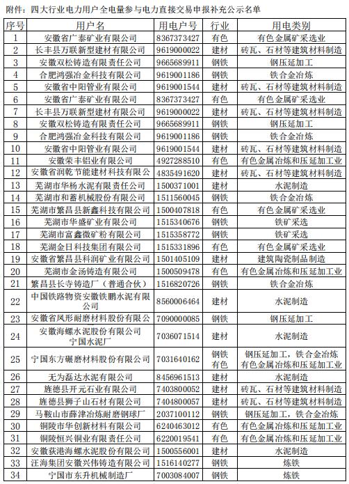 安徽補(bǔ)充公示94家四大行業(yè)電力用戶全電量參與電力市場交易名單