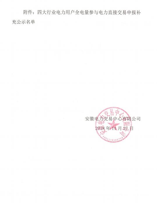 安徽電力交易中心日前發(fā)布了《關(guān)于四大行業(yè)電力用戶全電量參與電力市場交易名單補(bǔ)充公示的通知》,補(bǔ)充公示94家電力用戶。公示時(shí)間為2018年11月27日至12月3日。逾期不予受理。