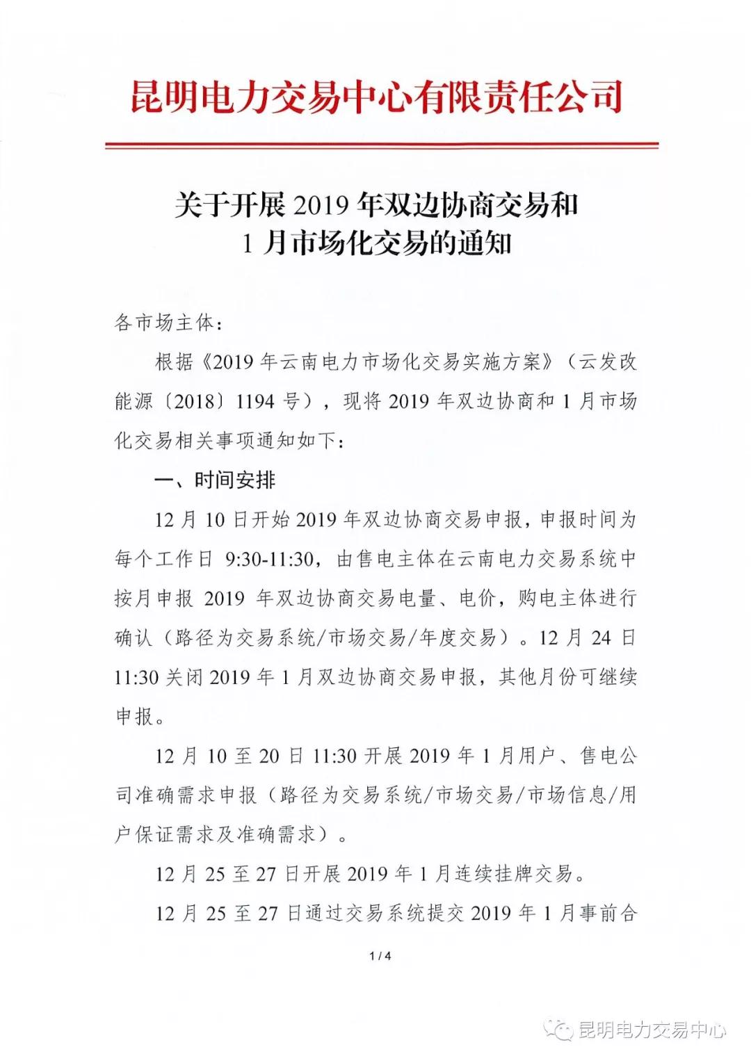 云南2019年雙邊協(xié)商交易和1月市場化交易時(shí)間安排