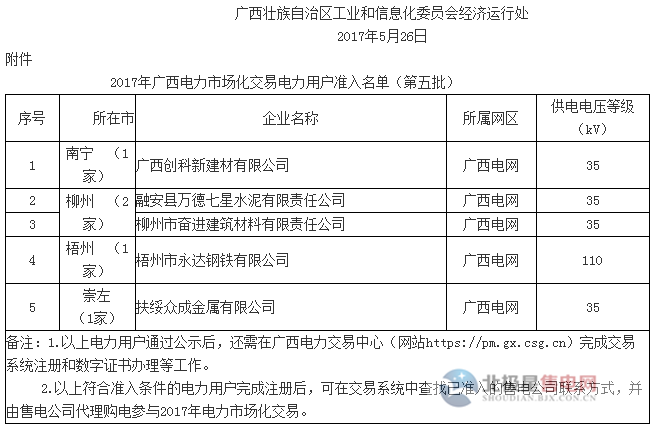廣西工信委日前公示了2017年電力市場(chǎng)化交易電力用戶準(zhǔn)入名單(第五批),有5家企業(yè)在名單上,所屬供電電壓等級(jí)有4家為35KV,1家為110KV,詳情如下: